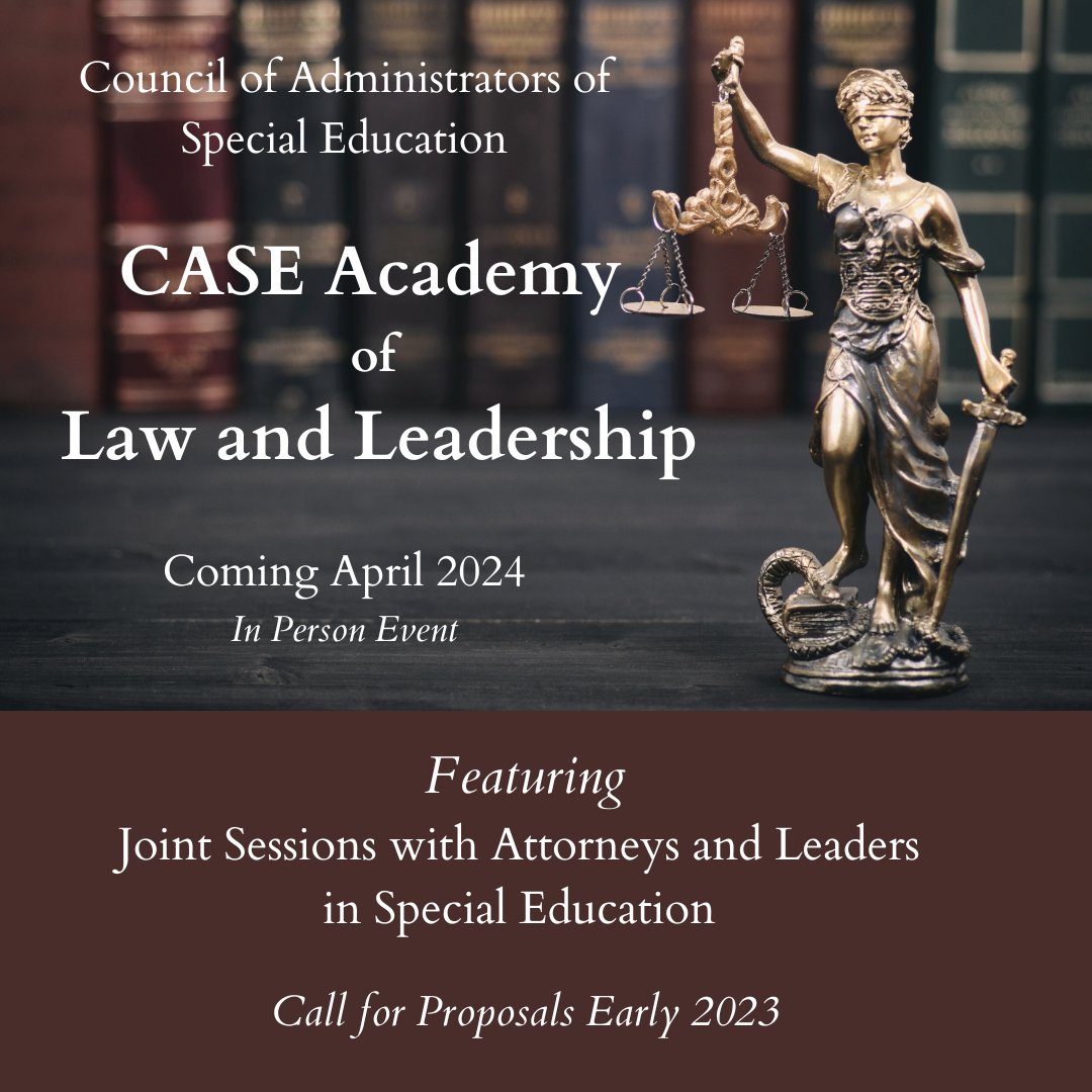 The CASE Academy of Law and Leadership is a premier professional learning experience designed for special education leaders and special education school district attorneys. This academy brings together nationally recognized experts, both school district experts and legal experts, to provide in-depth training on legal foundations, leadership practices, and policy issues that shape the field of special education. Participants engage in sessions focused on real-world application, including legal compliance, effective decision-making, strategic leadership, and current issues impacting districts nationwide. Whether you’re strengthening your legal knowledge or refining your leadership skills, the Academy equips you with practical tools to lead with confidence and clarity.