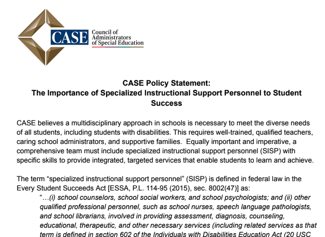CASE POLICY STATEMENTSPolicy and advocacy are important parts of the CASE mission. CASE consistently follows legislative action and advocacy related to special education programs. The following information includes policy statements and comments impacting special education. CASE Comments includes
